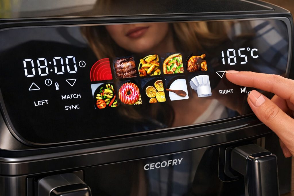 3. Window – большое смотровое окно в крышке. Теперь не нужно открывать корзину, чтобы проверить, не подгорело ли мясо или достаточно ли зарумянилась выпечка. Тепло не уходит, процесс под контролем, а результат получается точнее. Яркие примеры – Cecofry Experience Window 6000 или Cecofry Advance 9000 Window: особенно удобно для новичков и тех, кто часто печёт или запекает целую курицу.